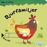 Dra i fliken på varje uppslag. Då plötsligt finns det fler gömda flikar att dra i. Nu kan du se vad djuren gör. Ett härligt första möte med djuren på bondgården..
